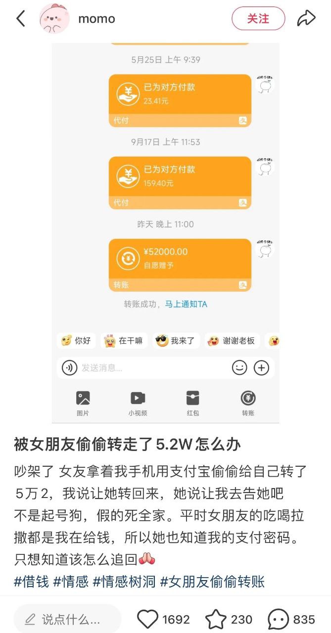 【吃瓜爆料】被女朋友偷偷转走了5.2万怎么办